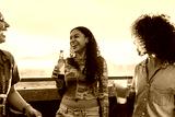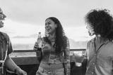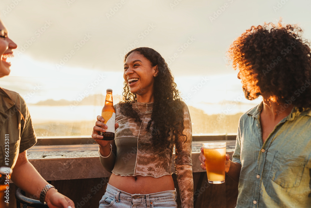 A group of young adults shares a moment of laughter while enjoying beers on a rooftop at sunset.