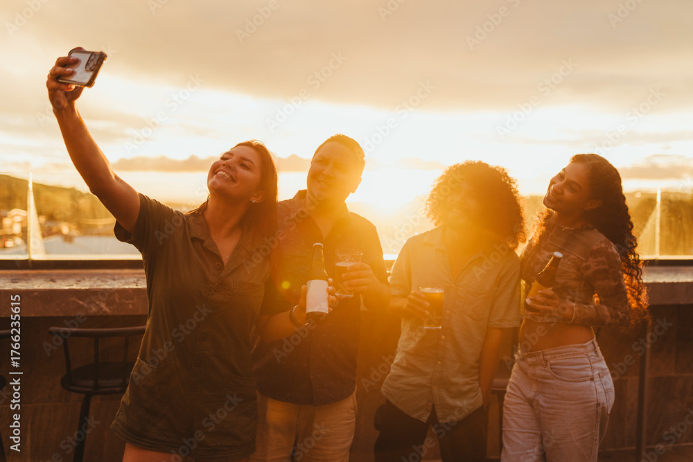 A joyful group of friends poses for a selfie on a rooftop bar during a stunning sunset.