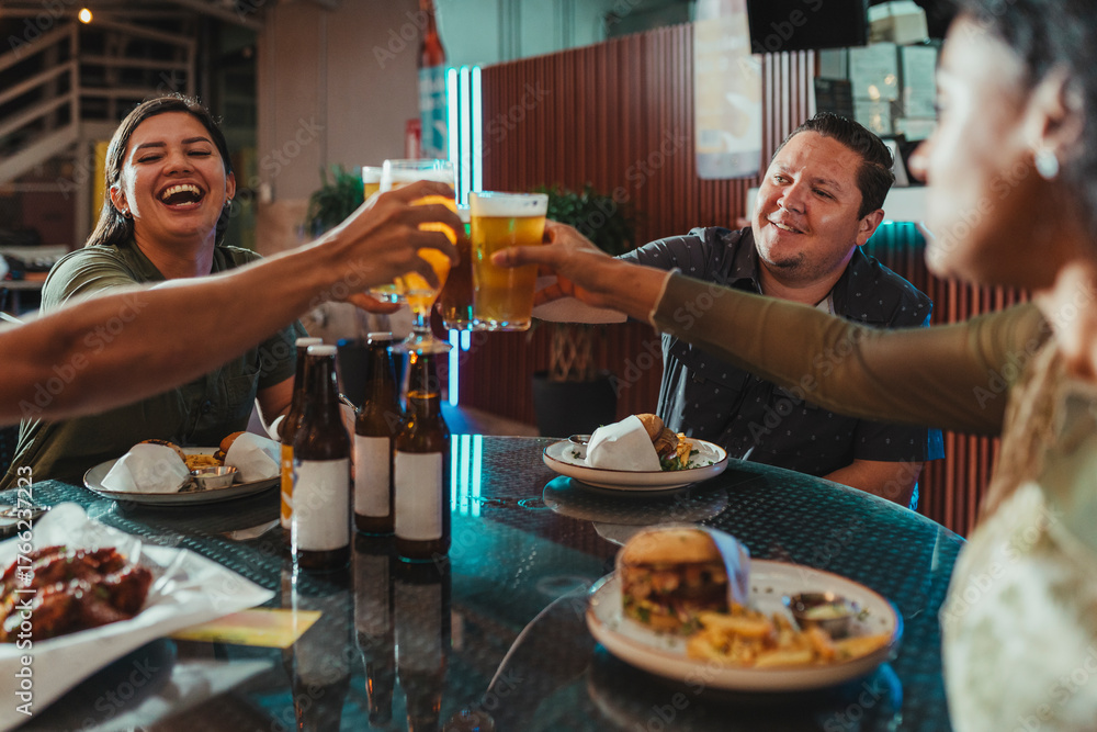 Latino friends celebrating with beer smiling around table at night