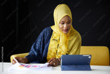 Muslim woman wearing a yellow hijab looking documents and tablet on the table