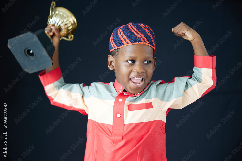 Muslin boy triumphantly holds a golden trophy