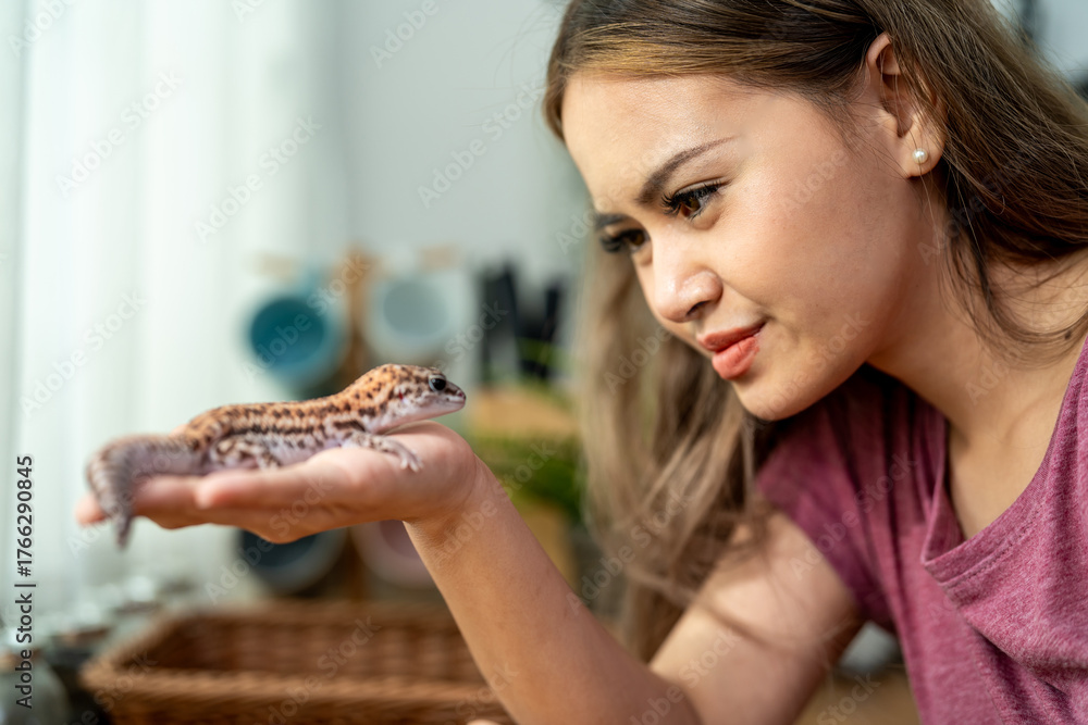 Asian young female owner play with her leopard gecko in kitchen at home.