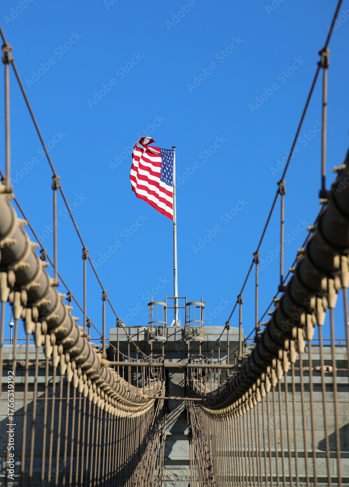 American flag high on the Brooklyn Bridge with a blue sky background in New York City USA