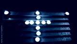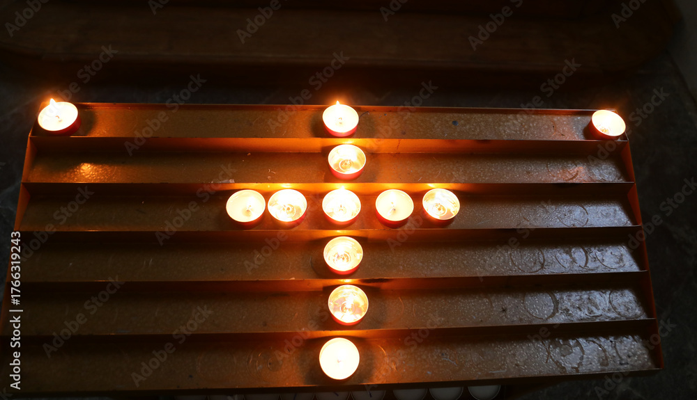 Lit religious candles creating a cross bright symbol in a church prayer spot