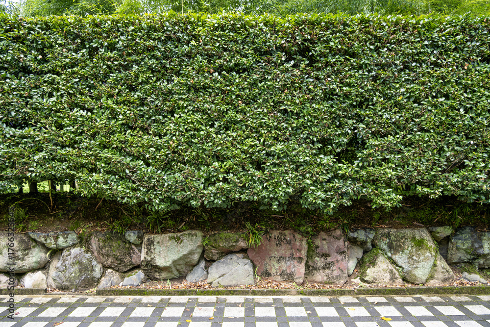 Neatly trimmed green hedge growing above a stone retaining wall along a tiled pedestrian walkway. Background texture of tree screening with clean landscaping design in a park or as residential fencing