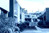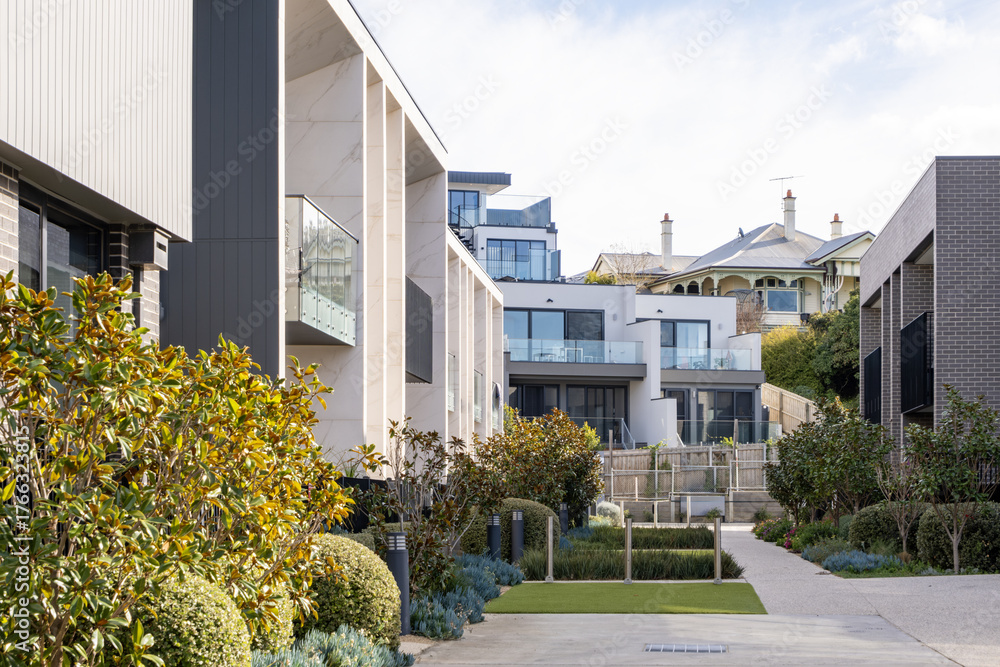 Modern luxury residential buildings in an upscale Australian neighborhood, featuring contemporary architecture and landscaped gardens. High-end property development with urban design aesthetics