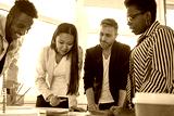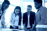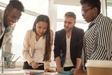 Multiethnic team of young managers working on new project in conference room, standing around table and brainstorming, low angle view