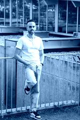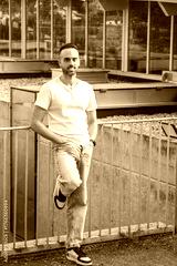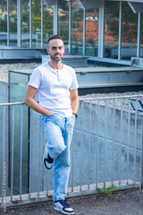 A young man dressed in a shirt and jeans, standing on the street with his hands in his pockets, presenting a casual and confident appearance.
