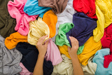 Young adult woman hands holding and sorting cluttered messy colorful t shirts. Making clothes neatness. Closeup. Point of view shot. Flat lay. Top down view.