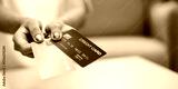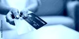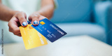 Financial concept close-up of credit and debit card transactions in indoor setting