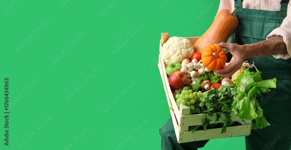 Male farmer with fresh vegetables and fruits on green background with space for text, closeup