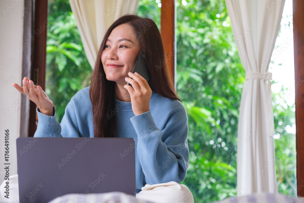 Portrait image of a beautiful woman talking on mobile phone while using laptop computer on the bed