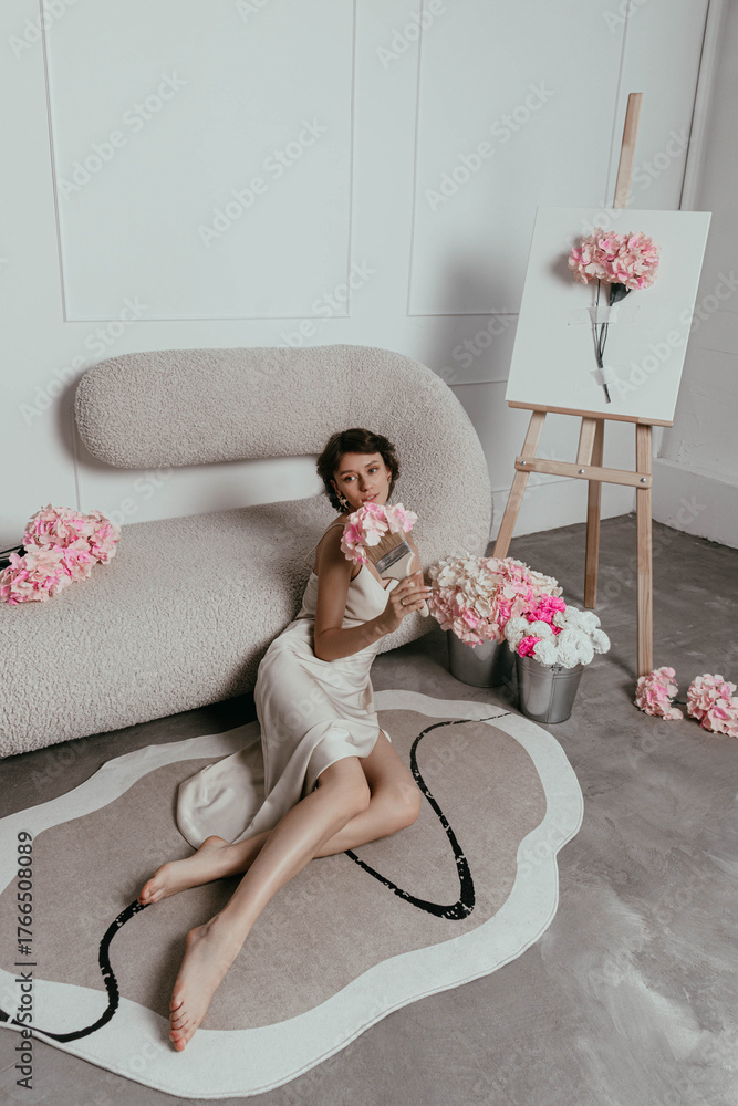 model sits gracefully on a unique couch in a studio, holding colorful flowers. easel nearby displays floral artwork, enhancing the artistic vibe of the soft-lit environment