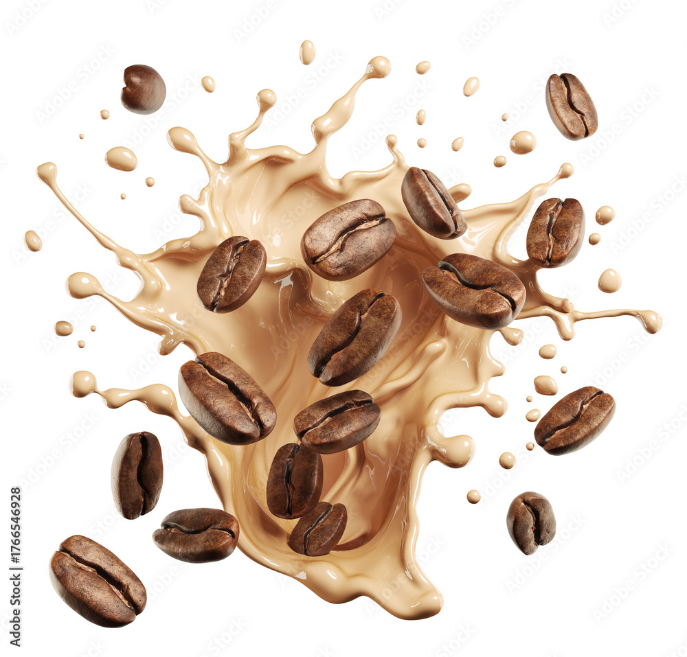 Roasted coffee beans floating in a splash of brown coffee liquid 3d illustration.