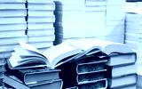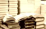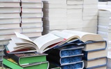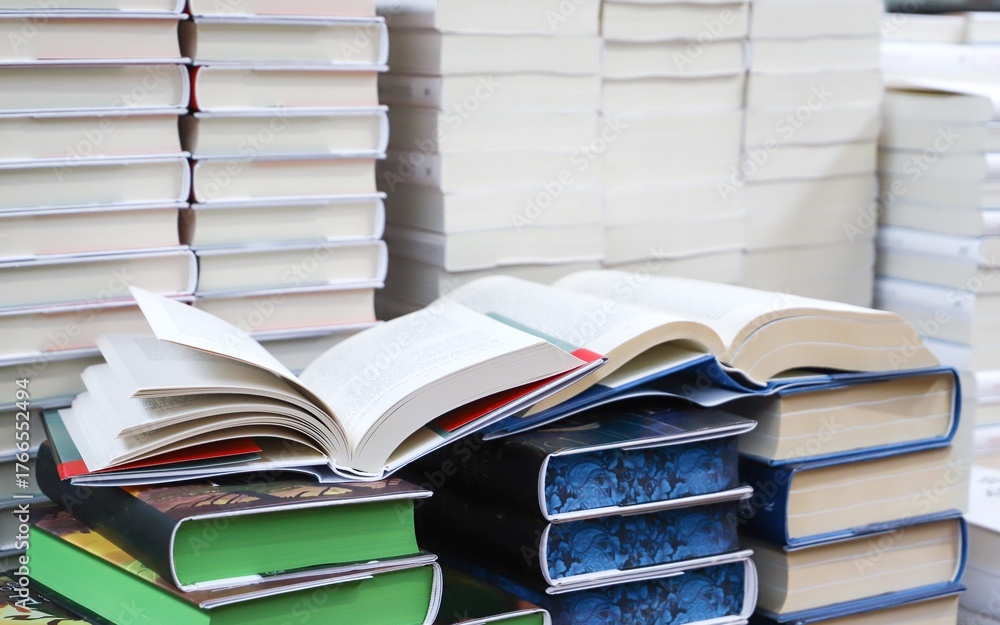 stack of books, close up. Open book on the table in library. Back to school concept. Open book on table with blur bookshelf background