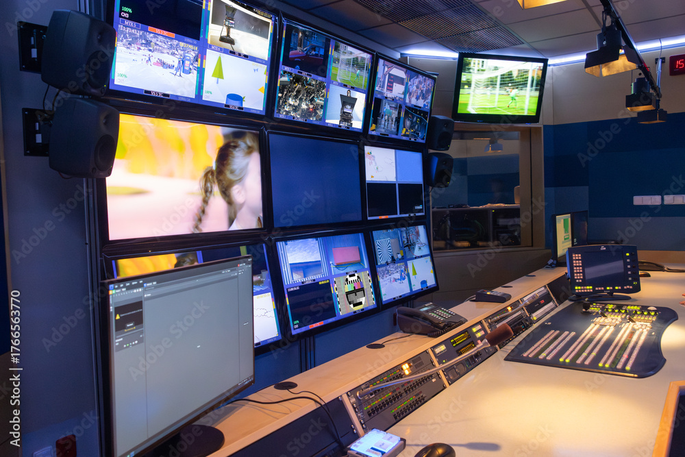 Interior view of a fully equipped broadcast studio with multiple screens and control consoles.