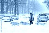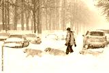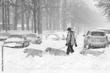 Person Walking Four Golden Retriever Dogs on Leash Through Deep Snow in Winter City