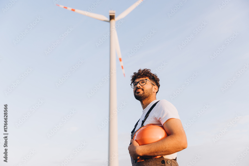 Technician holding helmet looking up at wind turbine in sustainable energy plant