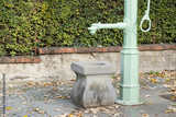 Vintage stone water fountain with green metal pump and decorative handle, surrounded by autumn leaves on cobblestone path, showcasing historical urban design and charm