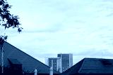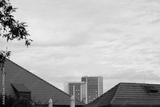 Rooftops of residential buildings with terracotta tiles, contrasting against a modern skyscraper in the background, showcasing urban architecture and development