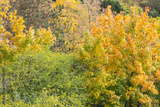 Vibrant autumn foliage featuring a mix of orange, yellow, and green leaves on trees, creating a picturesque landscape that embodies the beauty of seasonal change and nature's artistry