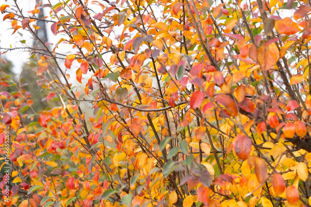 Vibrant autumn foliage featuring a mix of red, orange, and yellow leaves on branches, creating a stunning natural display in a serene outdoor setting with soft light