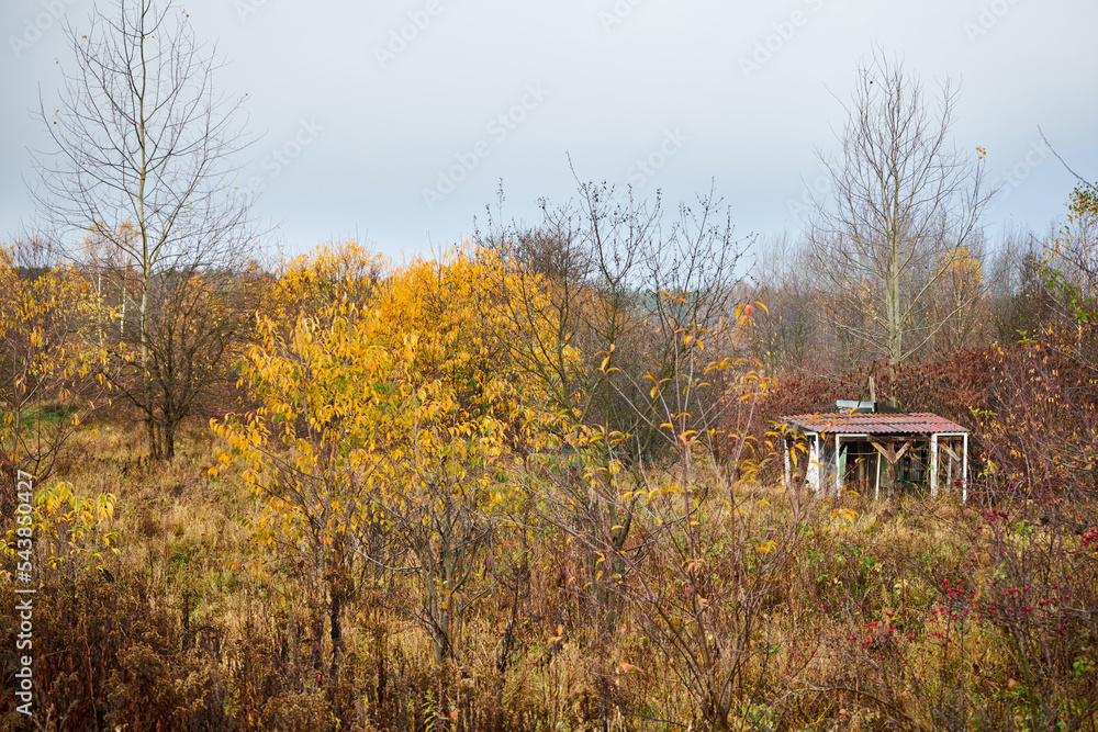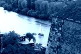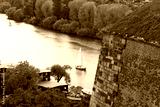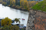 Scenic view of a tranquil river with a sailboat gliding past vibrant autumn trees and a historic stone structure, capturing the essence of nature and leisure activities