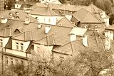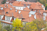 Aerial view of charming rooftops with red tiles, showcasing architectural details and vibrant greenery, creating a picturesque urban landscape in a serene environment