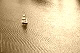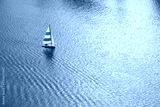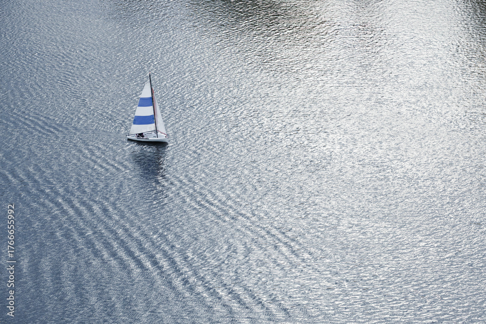 Sailboat gliding across tranquil water surface, creating gentle ripples, with a backdrop of serene reflections and soft clouds, embodying peaceful nautical adventure