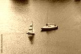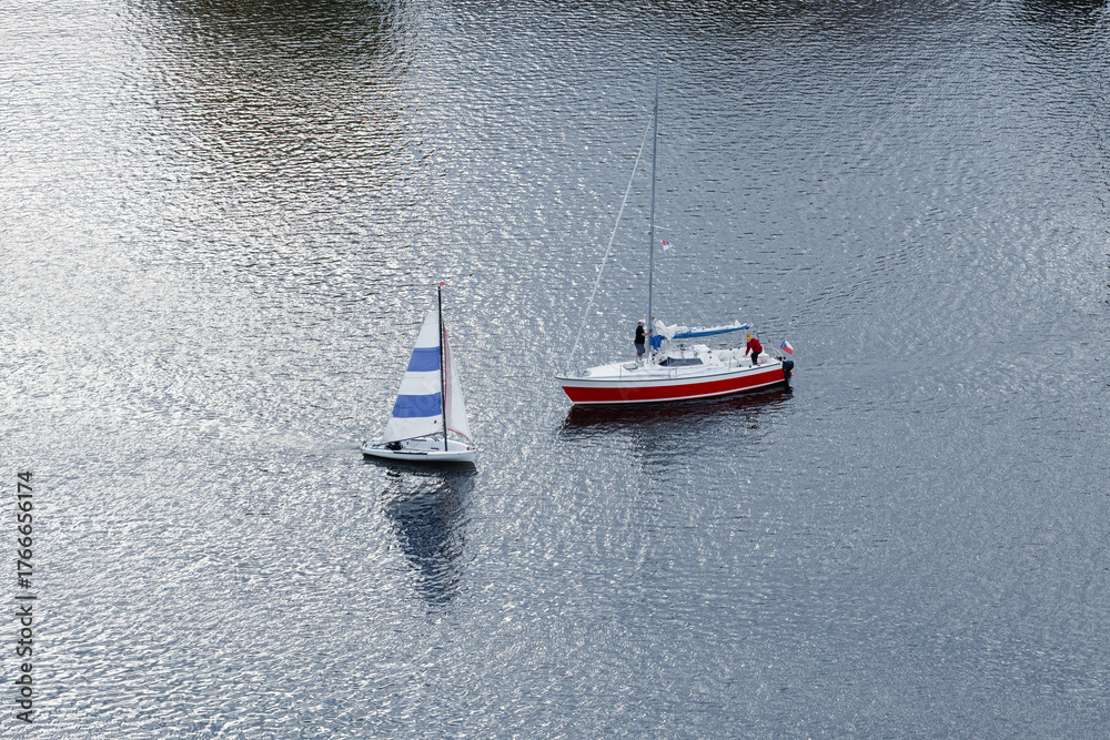 Sailboat with blue and white stripes gliding across shimmering water, while a motorboat with passengers navigates nearby, showcasing serene maritime activity and leisure