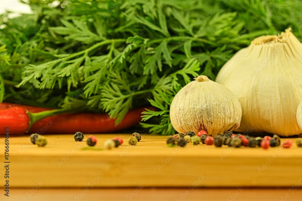 A bulb of garlic, red chili peppers, four-color pepper, and carrot tops on a wooden cutting board. The concept of cooking and vegetables in the home. Garlic - Allium sativum is a species of bulbous