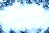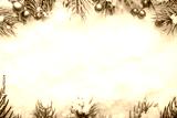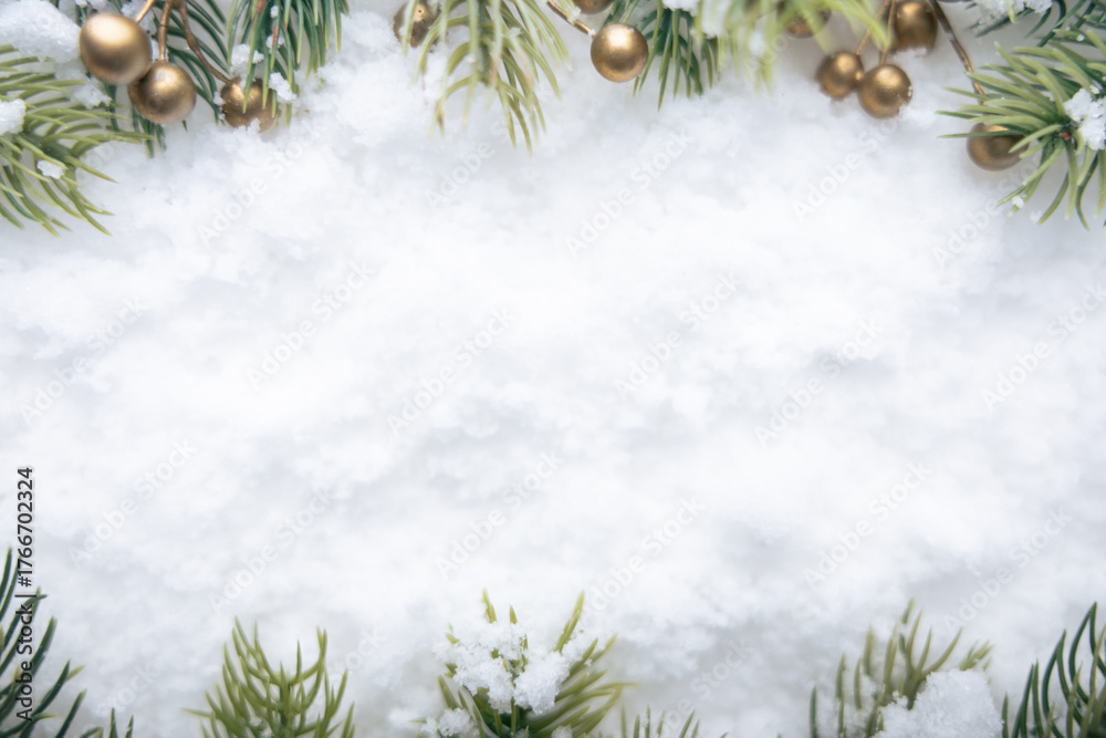 Snowy pines with golden decor and bokeh lights, Elegant winter scene featuring frosty pines and warm