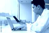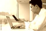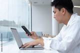 Focused man working with laptop and smartphone in modern office, representing multitasking, digital business, online communication, remote work, mobile technology, and professional productivity.