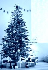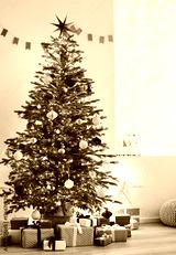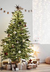 Stylish christmas living room interior with christmas tree, stars, gifts and decoration, Minimal xmas interior design template, Winter holiday home decor