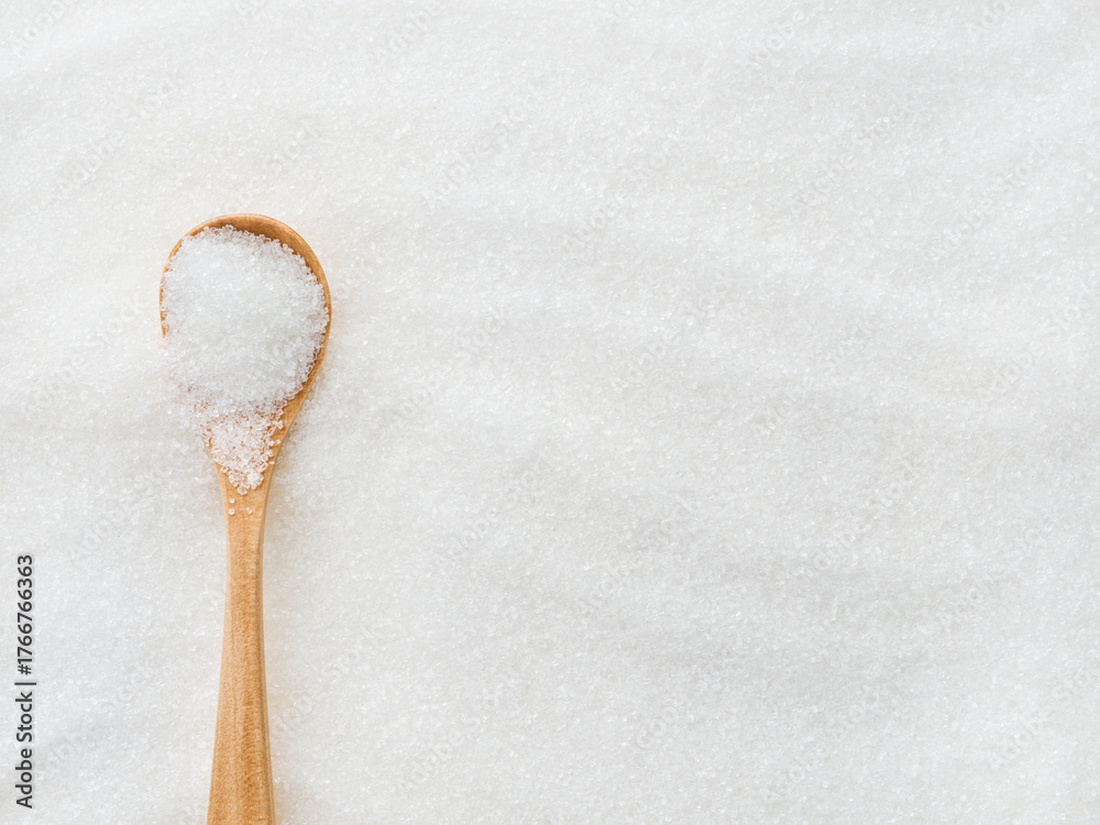 White sugar, painted waves and wooden spoon textured background with space for text. Close up.