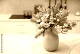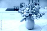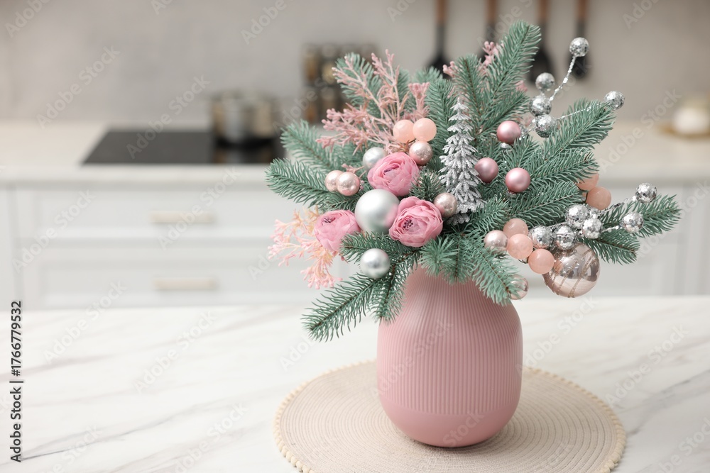 Beautiful composition with fir tree branches in vase on white marble table indoors, space for text. Winter decor