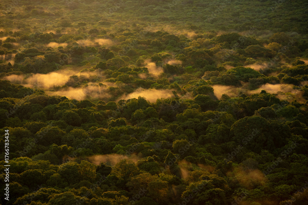 Aerial view of rain forest in Ethiopia at sunrise with fog resting on the trees.