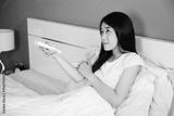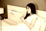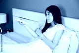 woman feeling cold and hand press remote air conditioner on bed in bedroom