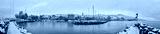 Winter panorama landscape, small port at lake Geneva or lake Leman under the snow, image taken in Lutry, canton of Vaud, Switzerland