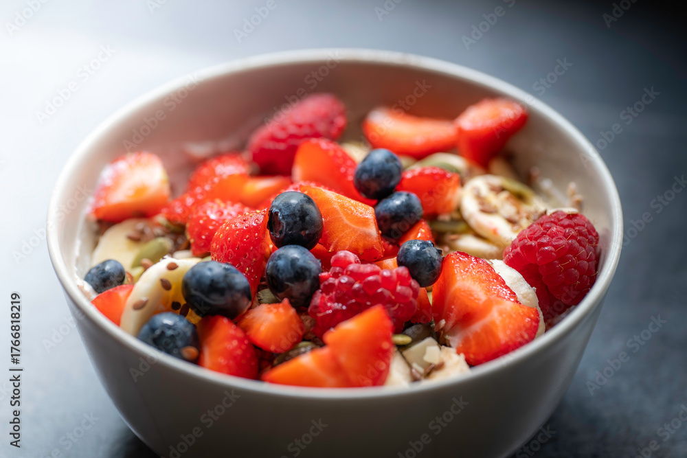 Oatmeal with fruit in a beige bowl on an anthracite countertop. The bowl is filled with strawberries, blueberries, raspberries, bananas, and flax seeds.