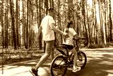 Girl learning to ride a bicycle with her father in forest. Loving daddy teaching his daughter how to ride a bike