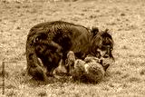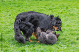 Hovawart Canis lupus familiaris adult dog and puppy playfully wrestling on grass