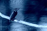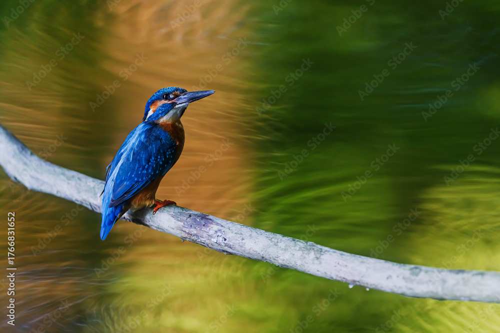 Common kingfisher Alcedo atthis perched above golden water reflection