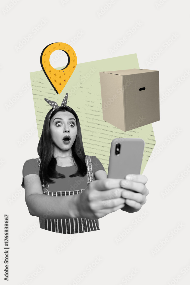 3D photo collage template trend artwork sketch of young woman shocked face hand hold smartphone box delivery buy shopping service client