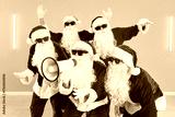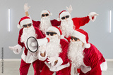 Santa group in costume uses megaphone. A dynamic team in a modern office mixes business aims with festive humor and Christmas cheer during a lively celebration. Fun team holiday pitch concept.