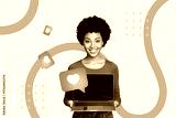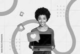 Poster image full 3d photo collage of happy girl hold laptop blogging notification like feedback recommendation popular influencer