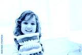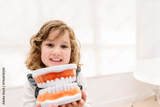 Little girl holding dental model learning oral hygiene smiling at camera