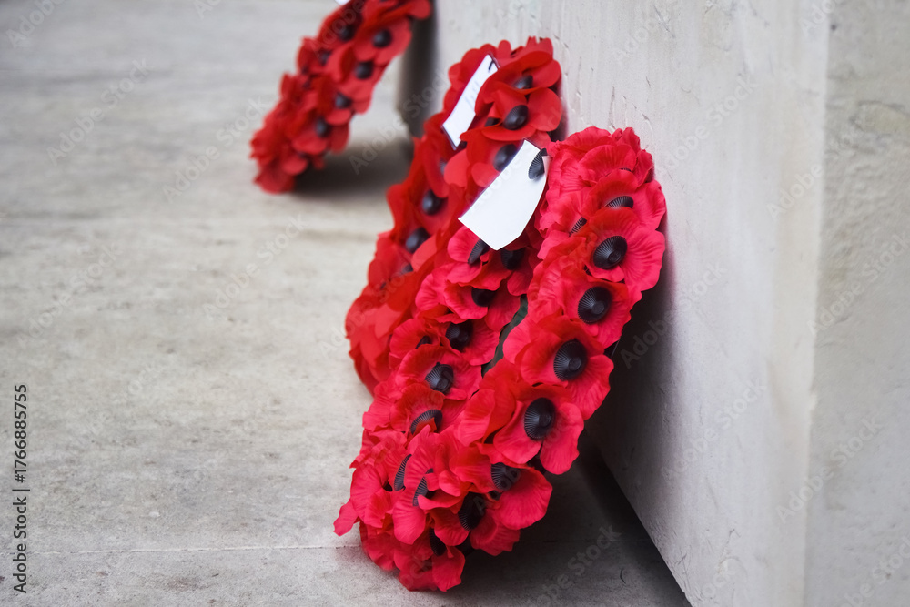 Remembrance Day Poppy Wreaths at Memorial. World War remembrance day.