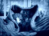 Two cats hide under the blanket. Outside, the winter snow. The concept of home comfort, security, warmth