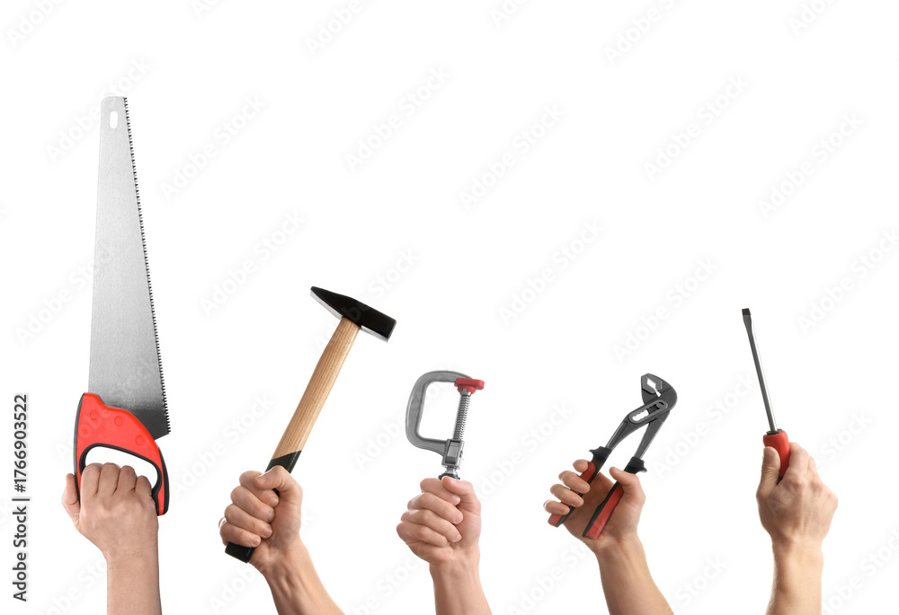 People holding different tools in hands against white background, closeup. Collage